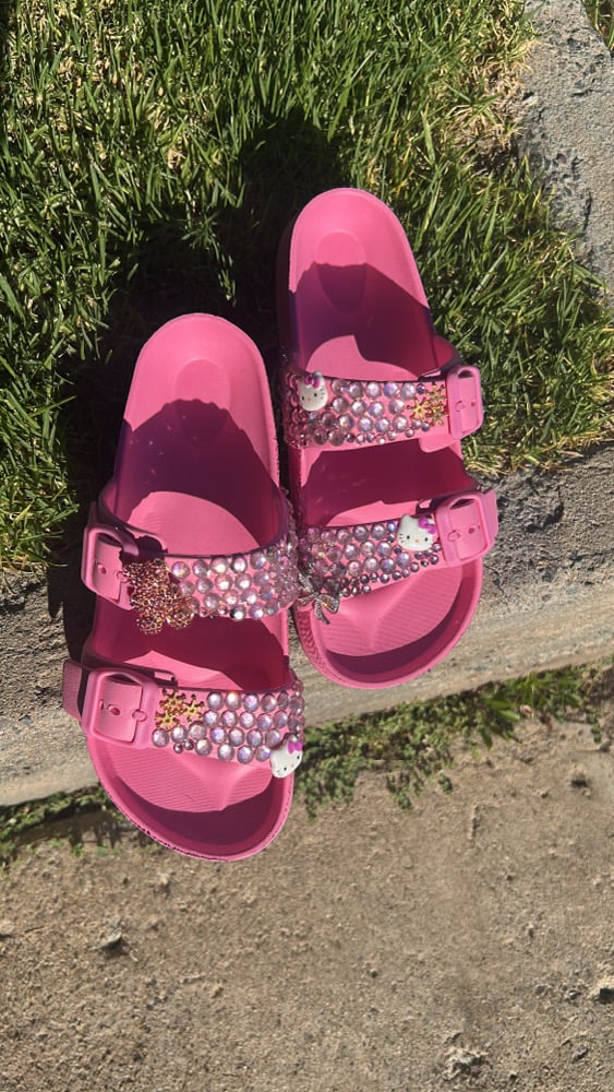 Step into playful sparkle with these pink sandals, featuring adorable Hello Kitty jewels and dazzling rhinestone accents. Perfect for adding a fun, stylish touch to any outfit, these sandals combine comfort and cuteness for little fashion lovers who want to shine with every step.